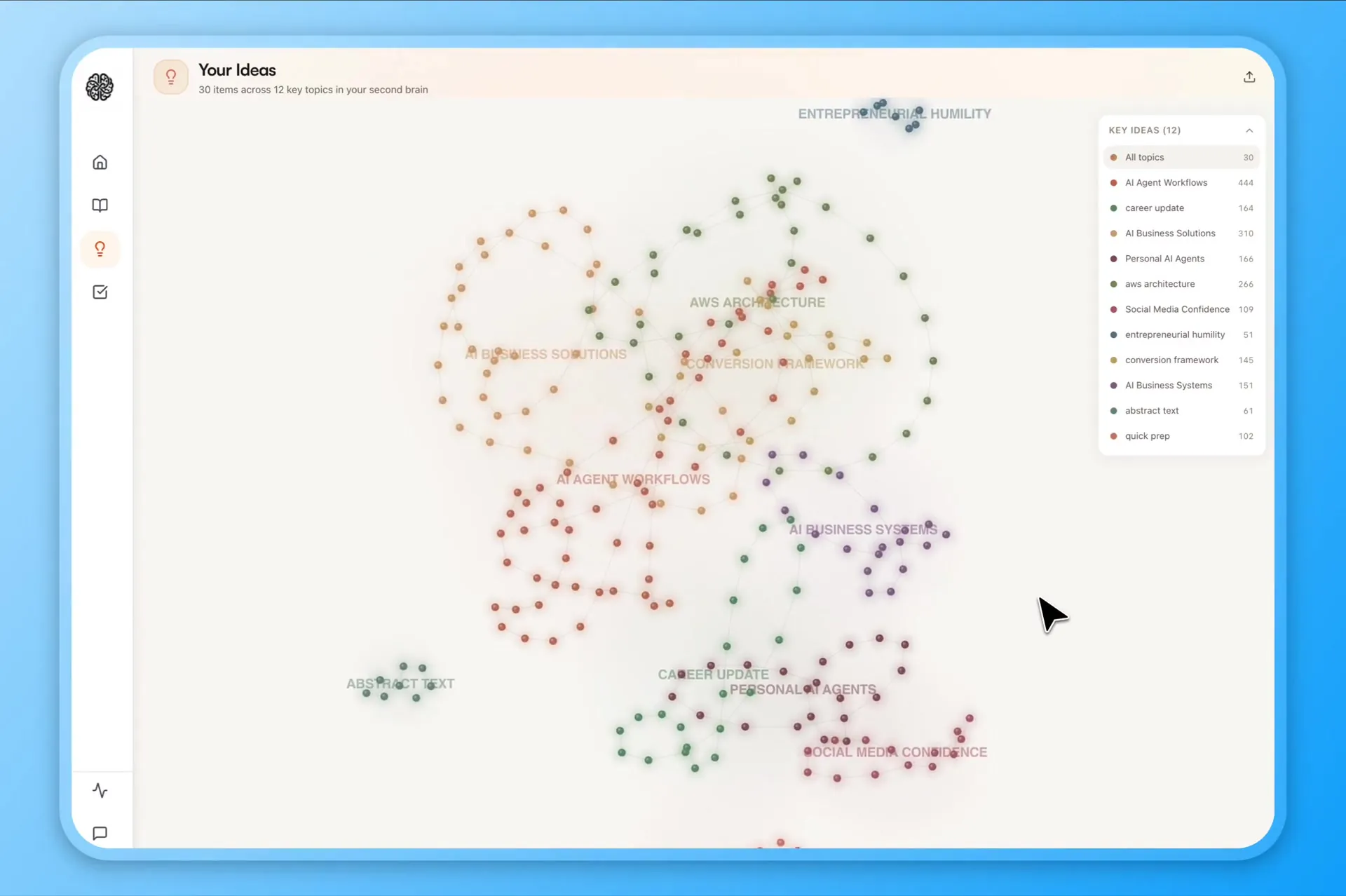 Ideas layers every save into 2D/3D views. Overlaps highlight when two distant readings share a concept—useful when a pricing note suddenly matters to a product doc you saved weeks ago.